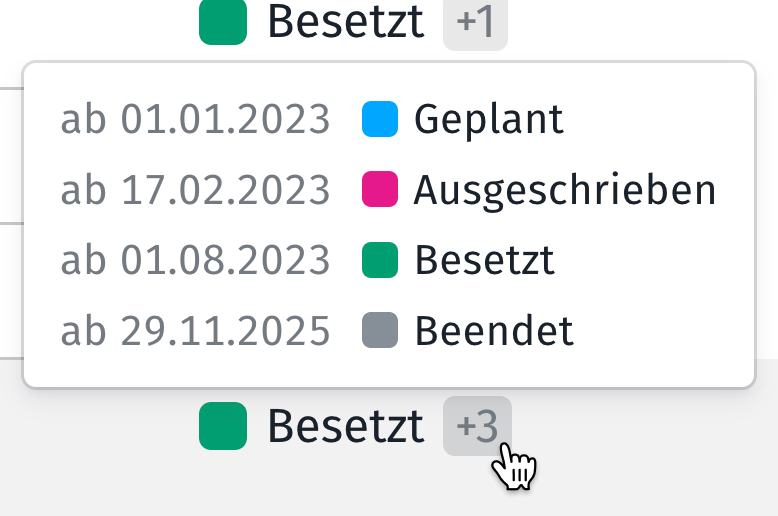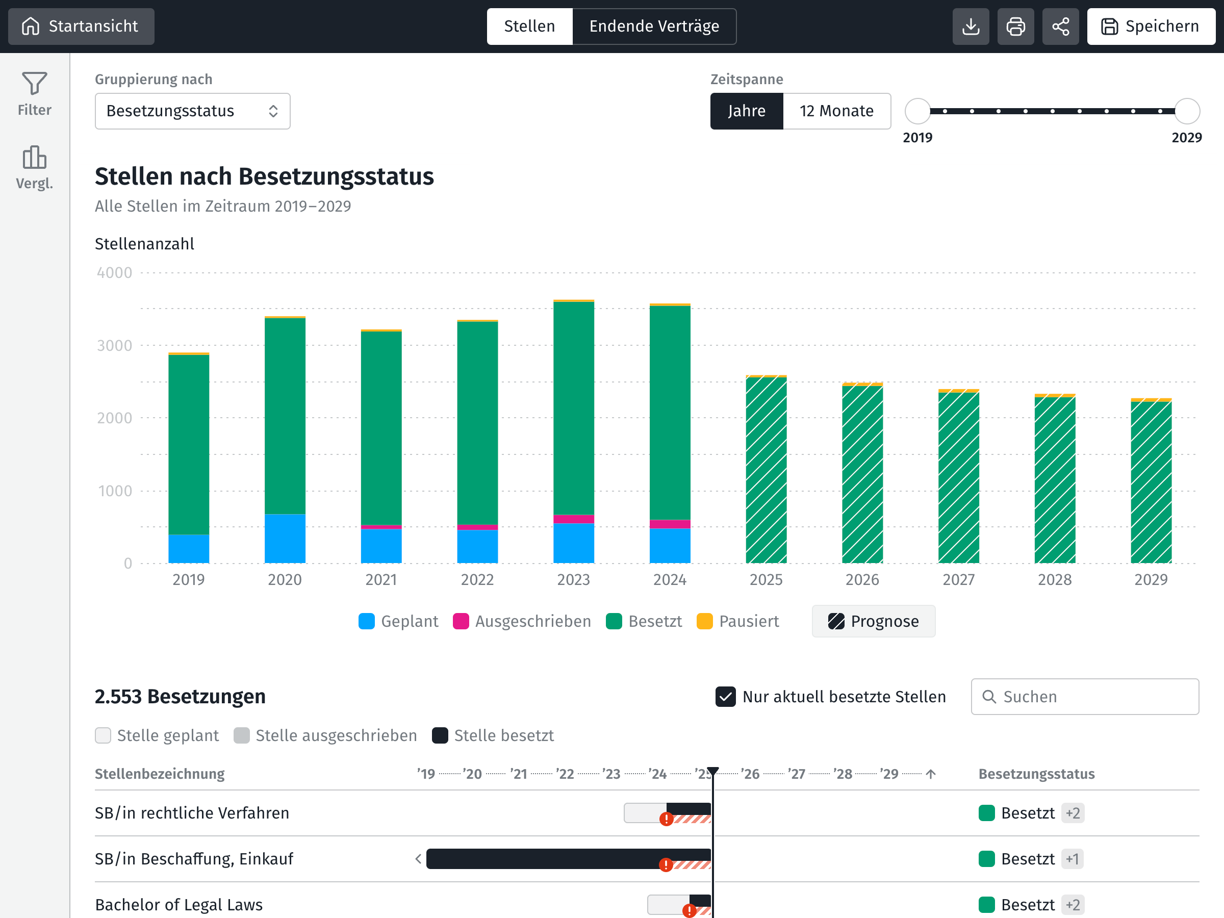 Während das Diagramm einen quantitativen Überblick bietet, listet die Tabelle unterhalb des Diagramms jede Besetzung bzw. jeden Vertrag auf, der den eingestellten Parametern entspricht. Sie besteht aus drei Spalten: der Stellenbezeichnung, einer Zeitleiste sowie einer dritten Spalte, die sich der aktiven Gruppierung anpasst.