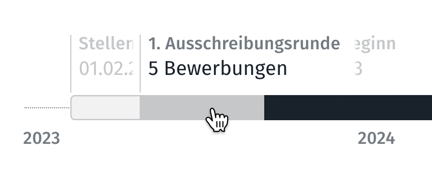 Oberhalb jedes Zeitleistenabschnitts wird das genaue Datum einer Statusveränderung bzw. die Anzahl von Bewerbungen einer Ausschreibungsrunde markiert. Wenn sich mehrere dieser Markierungen überlagern, fahren Sie mit dem Mauszeiger über die Abschnitte, um die zugehörigen Markierungen in den Vordergrund zu holen:
