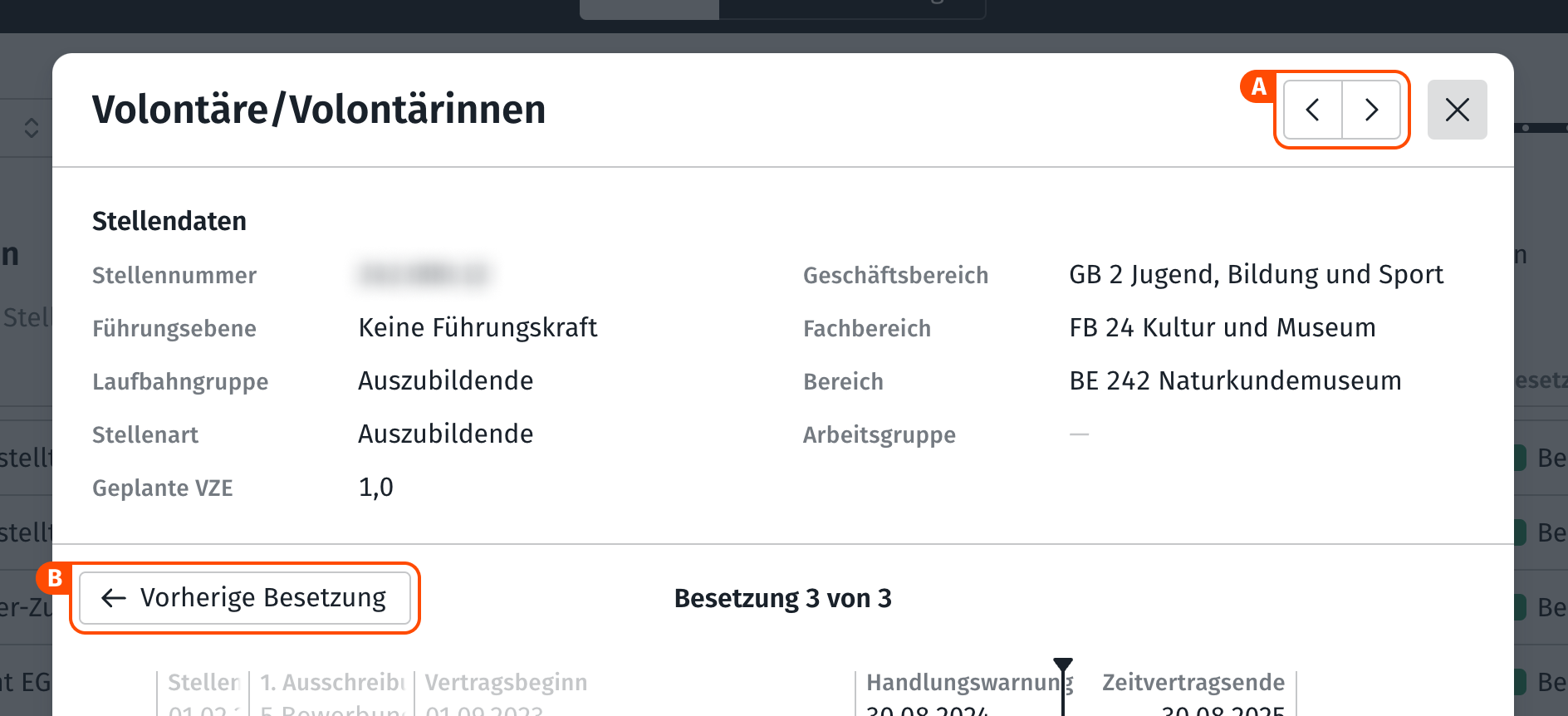 Wechseln zwischen Besetzungen (B) – Klicken Sie die Buttons »Vorherige Besetzung« oder »Nächste Besetzung«, um die Abfolge von Besetzungen innerhalb einer Stelle nachzuvollziehen.