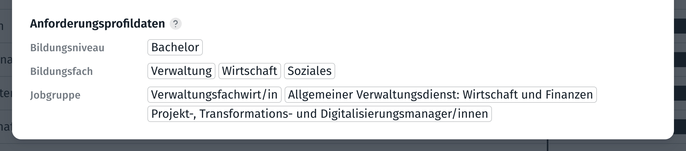 Für manche Einträge steht ein weiterer Abschnitt zur Verfügung, der Auskunft über Bildungsanforderungen und Stellenkategorien gibt. Beachten Sie, dass diese Daten unvollständig sind und können Fehler enthalten können, da sie auf einer KI-Auswertung von Anforderungsprofilen basieren.