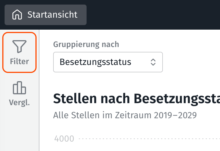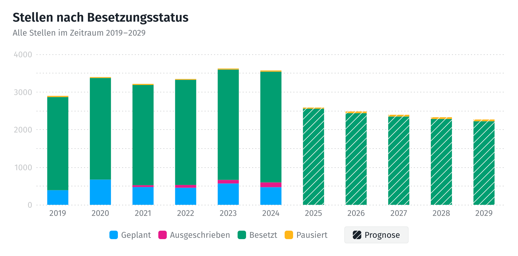 Beachten Sie, dass die Statistik »Besetzte Stellen« eine Annäherung ist und nicht exakt der offiziellen Stellenbesetzungsquote entspricht. Das liegt unter anderem daran, dass die Daten des Dashboards nicht exakt mit den Daten des Stichtags übereinstimmen, an dem die Stellenbesetzungsquote berechnet wird.