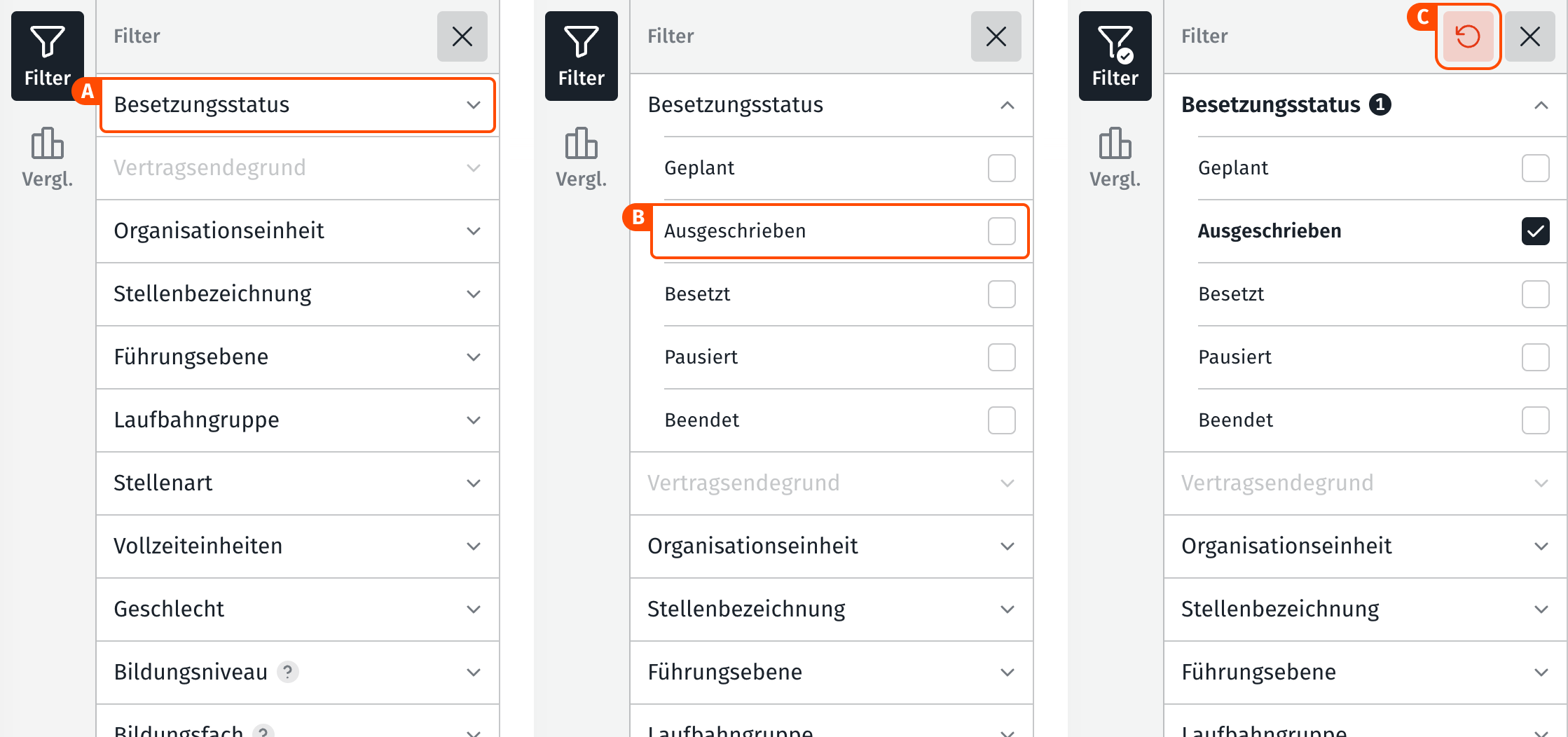 Mehrere Filter-Werte sowie unterschiedliche Filter-Einträge können beliebig miteinander kombiniert werden. Um alle Filter zurückzusetzen, nutzen Sie den Zurücksetzen-Button (C) in der oberen rechten Ecke.