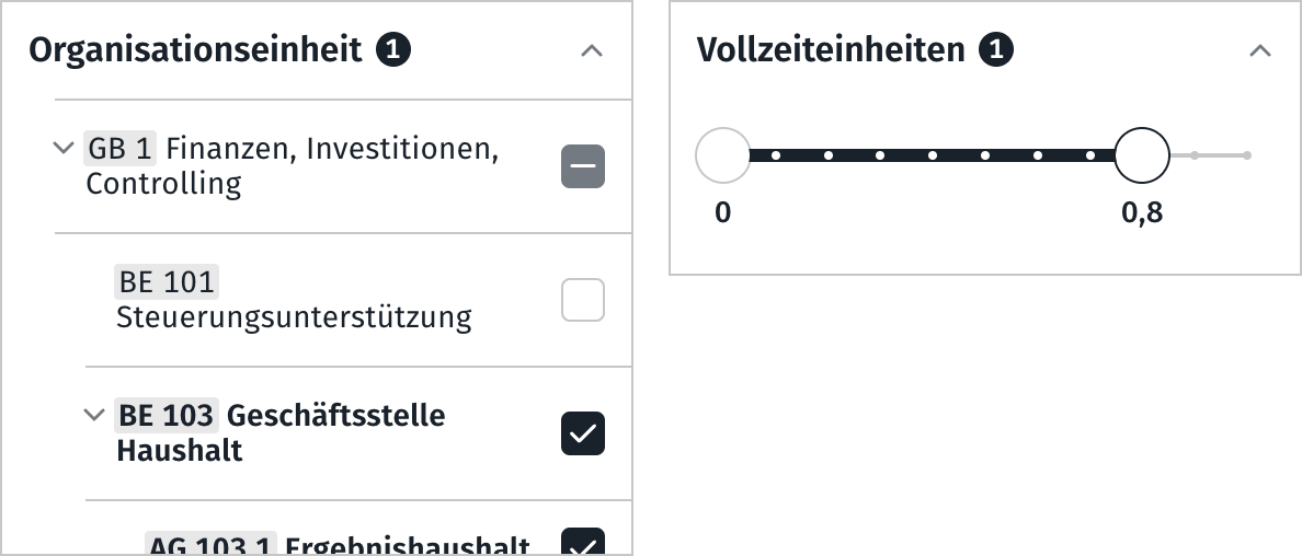 Vollzeiteinheiten – Nutzen Sie ähnlich zur Auswahl der Zeitspanne den Schieberegler, um einen Minimal- und Maximalwert an Vollzeiteinheiten einzustellen.