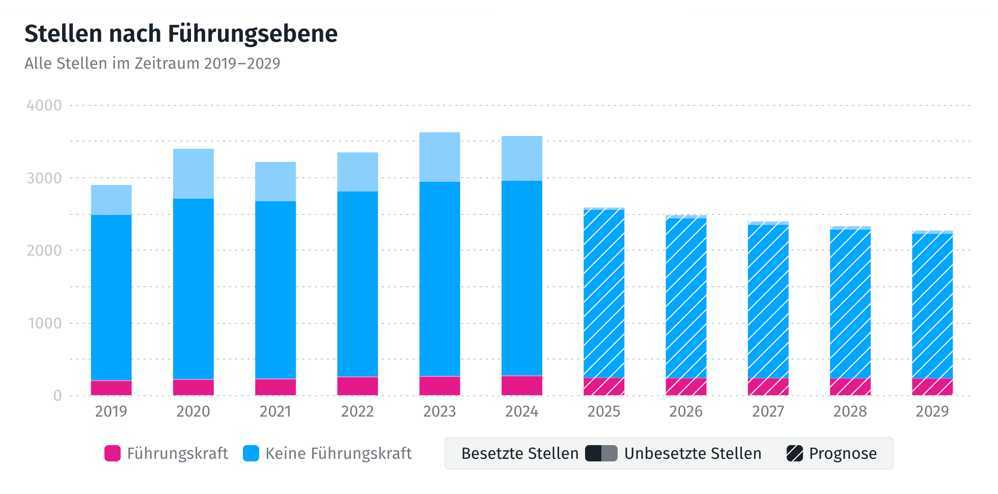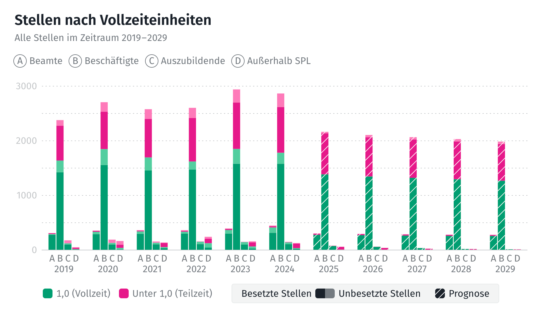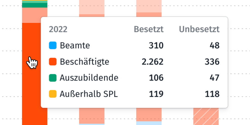 In manchen Kombinationen von eingestelltem Datensatz und ausgewählter Gruppierung kommt eine weitere Unterteilung der Balken hinzu. In diesen Fällen werden durch eine blassere Farbe für jede Kategorie unbesetzte von besetzten Stellen unterschieden.