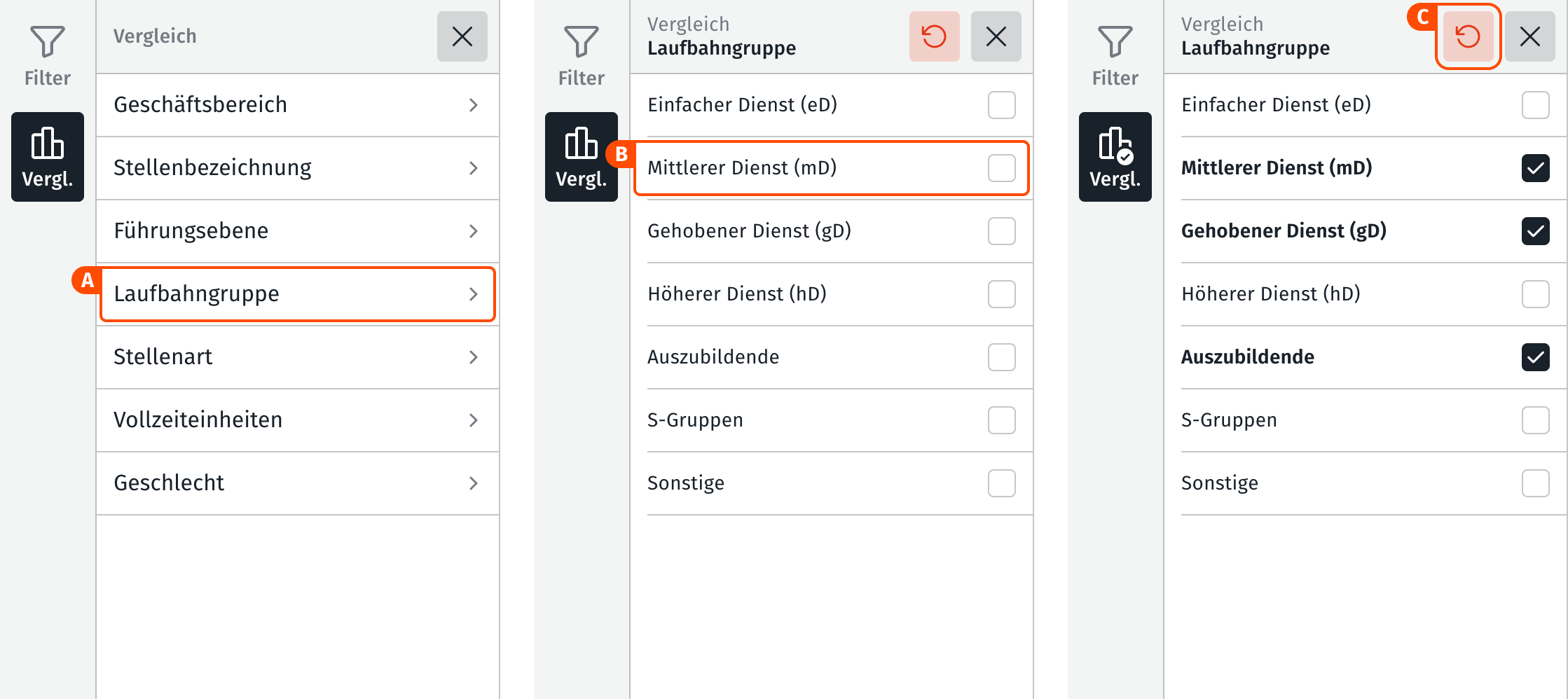 Der Vergleich-Button befindet sich unterhalb des Filter-Buttons und öffnet ähnlich zum Filter die Vergleichs-Seitenleiste. Klicken Sie auf einen Vergleichs-Eintrag (A), um den Vergleich des entsprechenden Merkmals zu aktivieren und die zur Verfügung stehenden Werte anzuzeigen. Über einen Klick auf einen Filter-Wert (B) können Sie diesen Wert dem Vergleich hinzufügen bzw. ihn daraus entfernen. Für jeden aktivierten Wert werden im Diagramm individuelle Balken angezeigt.