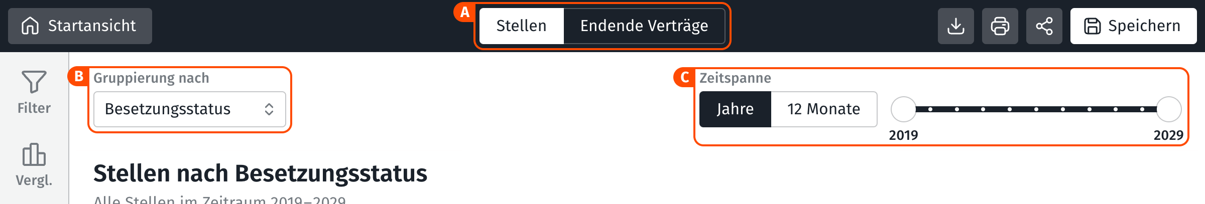 Datensatz (A) – Nutzen Sie diesen Schalter, um zwischen den Datensätzen »Stellen« und »Endende Verträge« zu wechseln, die Ihnen auch als Ausgangspunkte in der Startansicht zur Verfügung stehen.