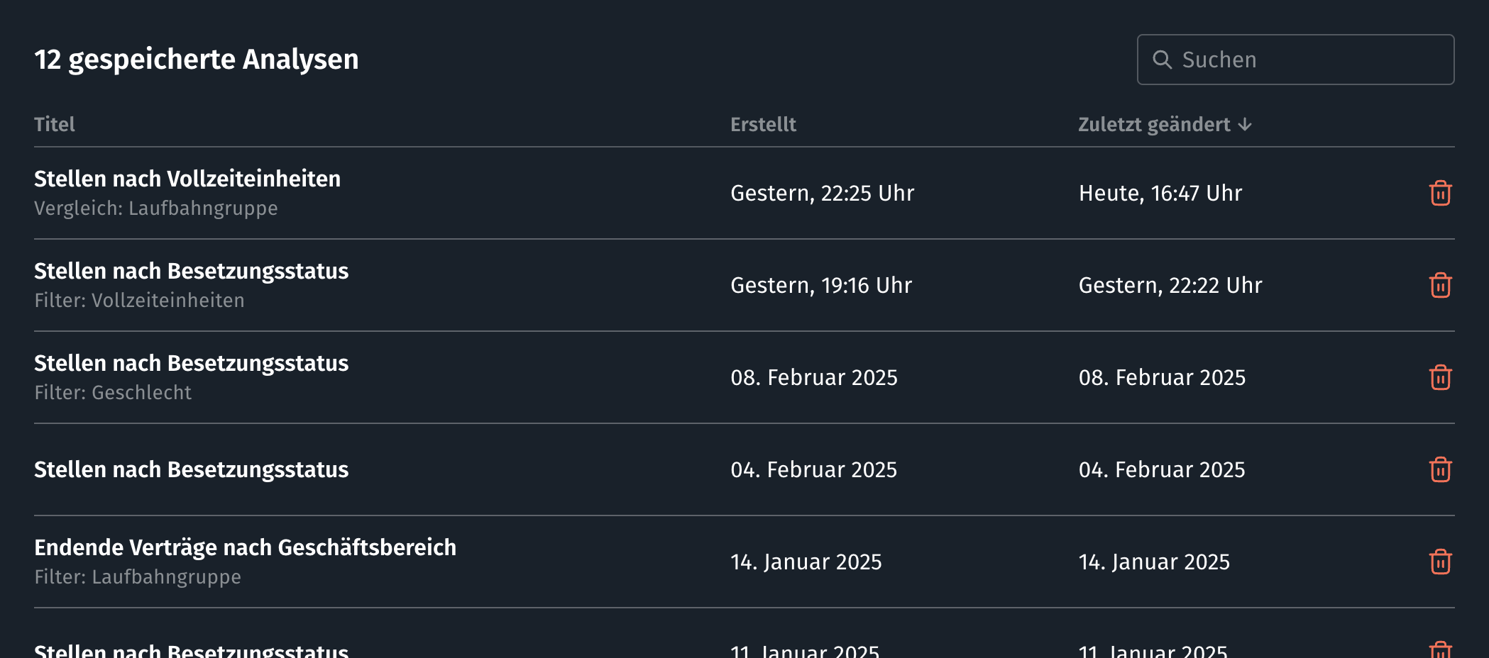 Alle gespeicherten Analysen werden in der Tabelle in der Startansicht aufgelistet. Um eine gespeicherte Analyse abzurufen, klicken Sie auf den entsprechenden Eintrag. Nutzen Sie das Papierkorb-Symbol auf der rechten Seite, um eine Analyse zu löschen.