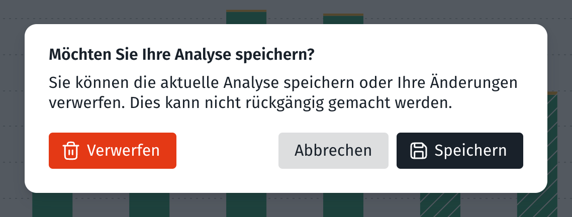 Wenn Sie eine Analyse ohne zu speichern verlassen, gibt Ihnen ein Warndialog vor dem Schließen die Möglichkeit, Ihre Analyse oder Anpassungen zu speichern oder sie zu verwerfen: