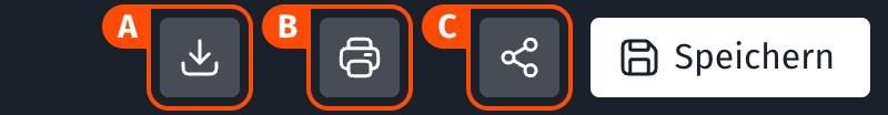 Um eine erstellte Analyse zu verbreiten oder weiterzuverarbeiten stehen Ihnen oben rechts neben dem Speichern-Button einige Funktionen zur Verfügung: