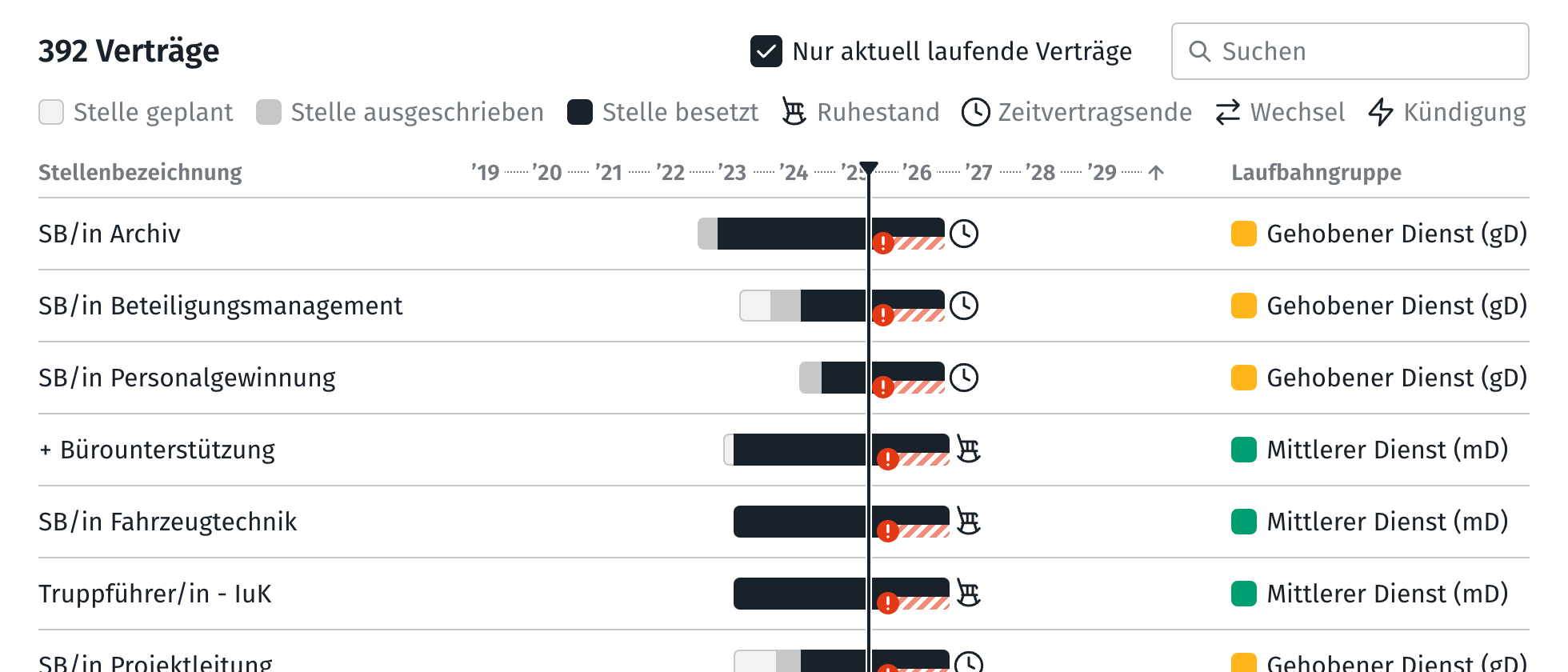 Die Zeitleiste visualisiert über die eingestellte Zeitspanne hinweg den Besetzungsstatus jedes Eintrags. Dazu werden Abschnitte in unterschiedlichen Farben angezeigt, deren Bedeutung in der Legende oberhalb der Tabelle aufgeschlüsselt ist. Rote Ausrufezeichen stellen Handlungswarnungen dar und markieren Zeitpunkte, ab denen weniger als 12 Monate bis zum Vertragsende verbleiben.
