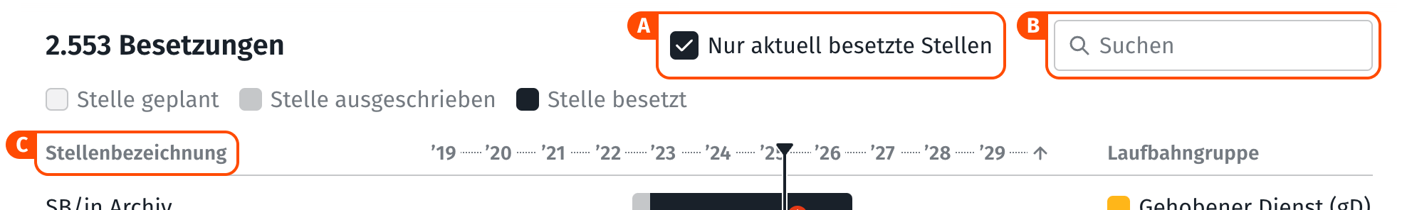 Sortierung (C) – Klicken Sie auf die Spaltenüberschriften, um die Tabelle auf- oder absteigend nach der entsprechenden Spalte zu sortieren. Im Fall der Zeitleiste richtet sich die Sortierung nach dem Zeitpunkt des Stellen- bzw. Vertragsendes.