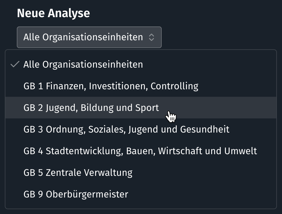Nach dem Einloggen gelangen Sie zur Startansicht des Dashboards. Hier haben Sie die Möglichkeit, eine neue Analyse zu starten, Überblicks-Statistiken verschiedener Organisationseinheiten einzusehen sowie zuvor gespeicherte Analysen zu laden (hierzu mehr im Abschnitt »Speichern«).