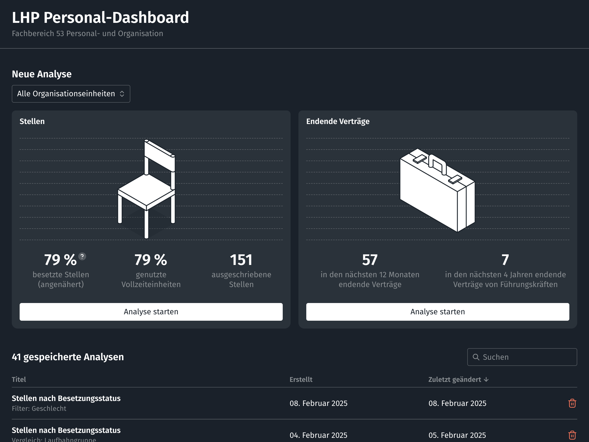 Das Personal-Dashboard bereitet vorhandene Daten zu Stellen, Ausschreibungen und Besetzungen auf, die aus der Loga-Software exportiert worden sind. Die quantitative Visualisierung der Daten sowie die Möglichkeit, Detailinformationen zu jeder Stelle einzusehen soll Führungskräfte der LHP in ihrer Personalplanung unterstützen.